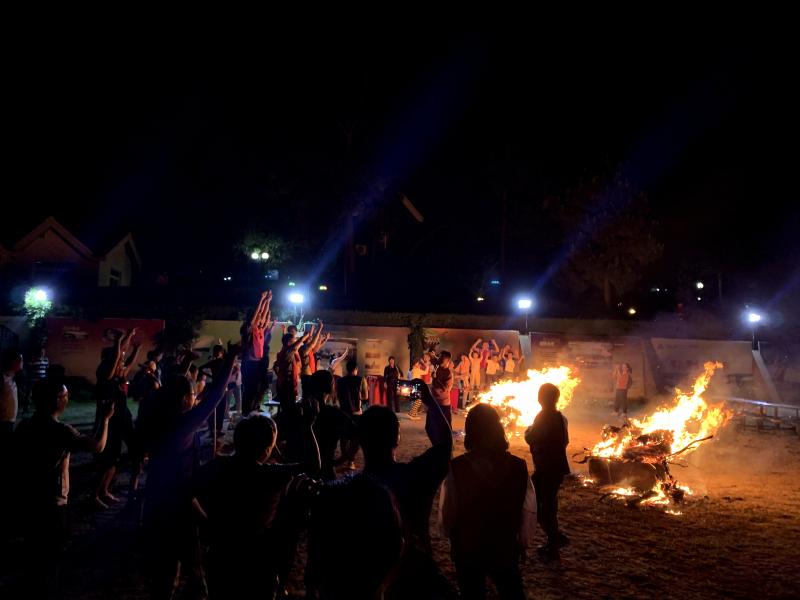 夜幕四合,工會(huì)主席王志凌點(diǎn)燃了火把,拉開了篝火晚會(huì)的序幕。在輕快歡快的音樂節(jié)拍下,紅藍(lán)兩隊(duì)隊(duì)員們手拉著手、肩并肩圍著熊熊篝火歡呼著、舞動(dòng)著、跳躍著、歌唱著,隊(duì)員們完全沉浸在歡樂的海洋里……當(dāng)《朋友》之歌響起時(shí),在場(chǎng)所有人一起放聲歌唱,將本次活動(dòng)的氣氛推向高潮!