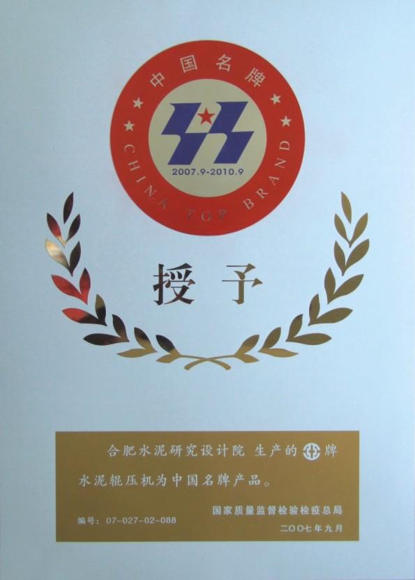 2007年9月11日,合肥院HFCG系列輥壓機(jī)產(chǎn)品榮獲“中國(guó)名牌產(chǎn)品”稱號(hào),開(kāi)創(chuàng)了建材行業(yè)科研院所自主研發(fā)和制造的產(chǎn)品獲“中國(guó)名牌”的先河